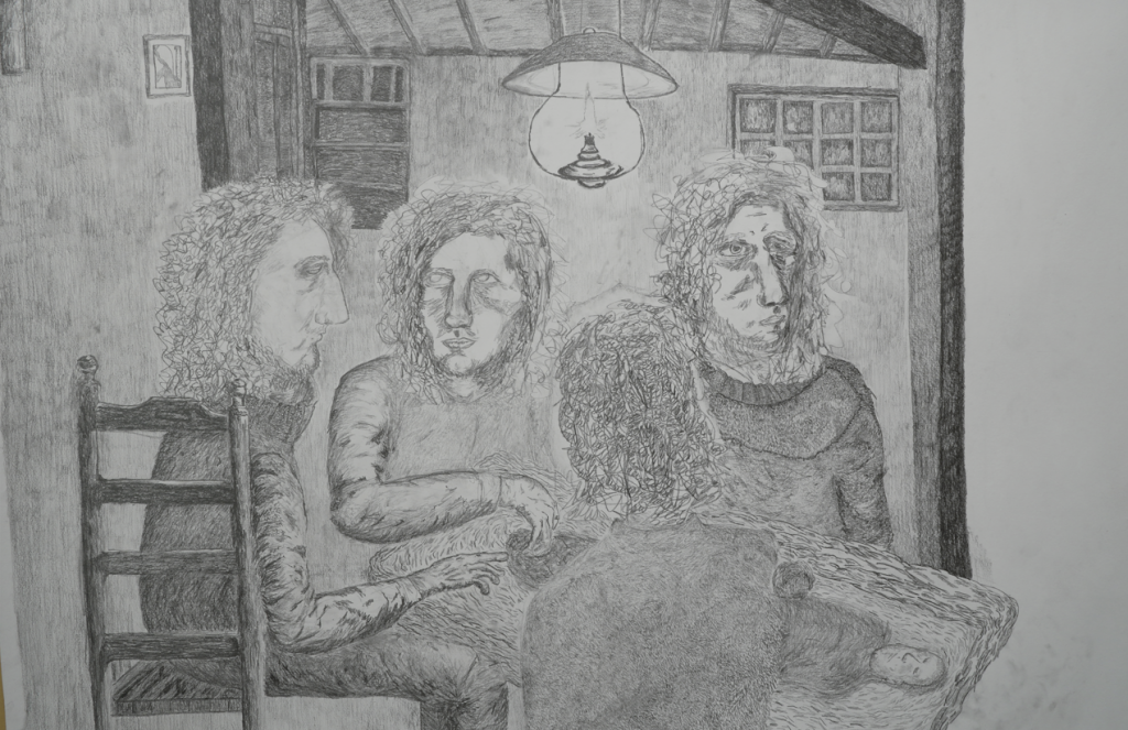 In de tekening van De Aardappeleters, gebaseerd op het gelijknamige schilderij van Vincent van Gogh, stelt Sam de vraag wat er zou gebeuren als hij zijn eigen leven en ervaringen zou vermengen met die van Van Gogh.